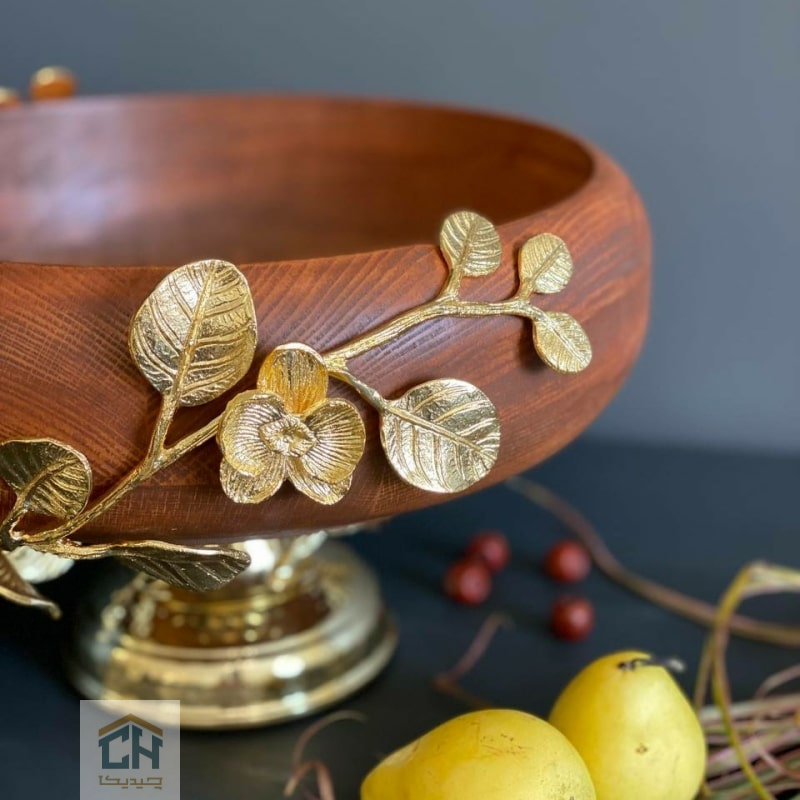 ترکیب استادانه کاسه عمیق چوبی با پایه جام مانند برنجی،تضادی لوکس از بافت گرم طبیعت و درخشش فلز ایجاد کرده است.این کاسه میوه خوری پایه دار با داشتن فضای وسیع،به راحتی حجم زیادی از میوه های فصل مثل سیب و پرتقال را در خود جای می دهد.شاخه گل ارکیده طلایی که با ظرافت روی بدنه کار شده،امضای اصالت این محصول است و آن را از یک ظرف میوه خوری چوبی ساده به یک کالای دکوراتیو تبدیل می کند.