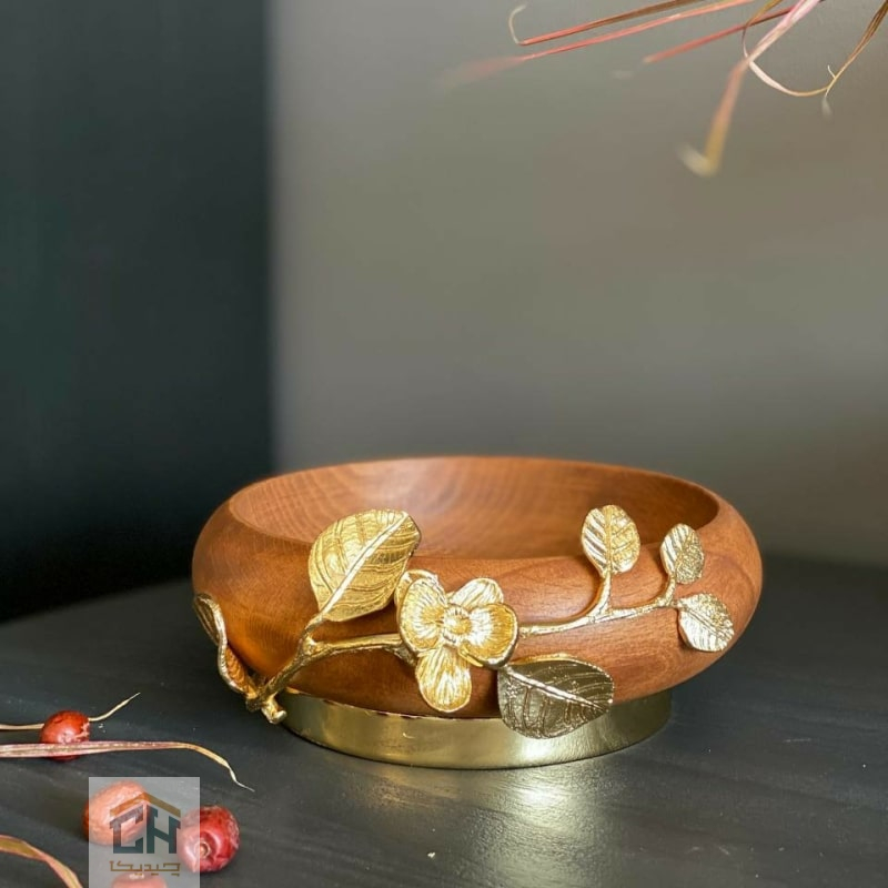این کاسه چوبی کوچک با هنرمندی تمام طراحی شده است.یک شاخه گل ارکیده برنجی با درخشش طلایی روی بدنه چوبی نشسته و تضادی لوکس ایجاد کرده است.وجود پایه حلقه ای برنجی مستحکم در زیر ظرف،علاوه بر زیبایی بصری،آن را با وقار خاصی روی میز نگه می دارد.این طراحی باعث می شود تا حتی ساده ترین تنقلات هم در آن جلوه ای اشرافی پیدا کنند.