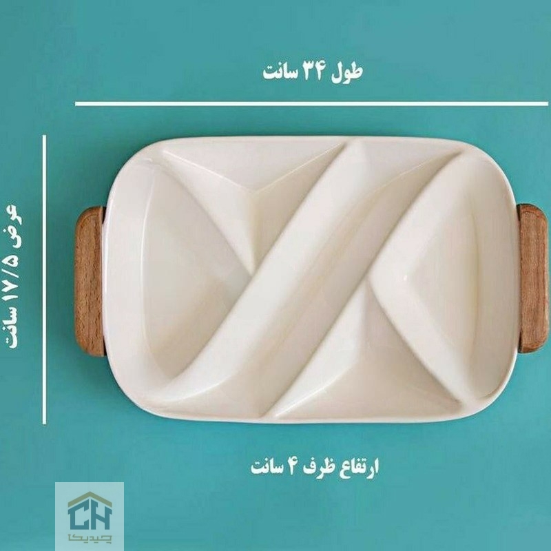 بدنه این محصول از سرامیک سفید با لعاب شفاف و مقاوم ساخته شده که در کنار دسته های چوبی طبیعی،حسی از پاکیزگی و گرما را منتقل می کند.اگر قصد خرید اردوخوری کشیده را دارید که با دکوراسیون مینیمال خانه تان هماهنگ باشد،این مدل بهترین انتخاب است.تقسیم بندی داخلی این ظرف به گونه ای است که می توانید انواع آجیل،شکلات و تنقلات را به صورت تفکیک شده اما در یک قاب واحد به نمایش بگذارید.