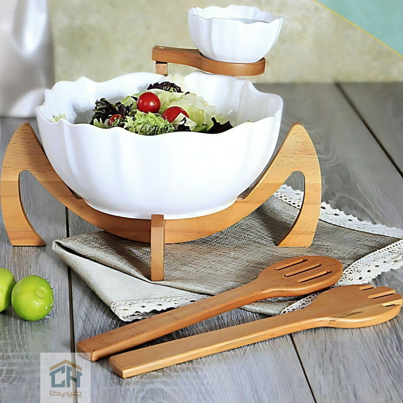 سالاد خوری سرامیکی پایه چوبی با جای سس مدل 50015