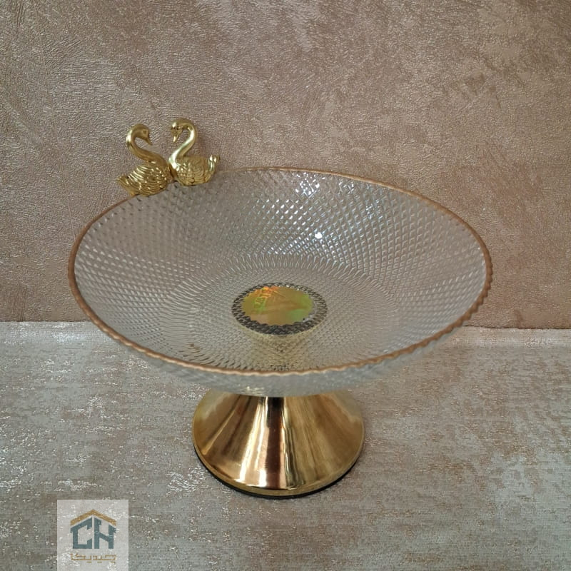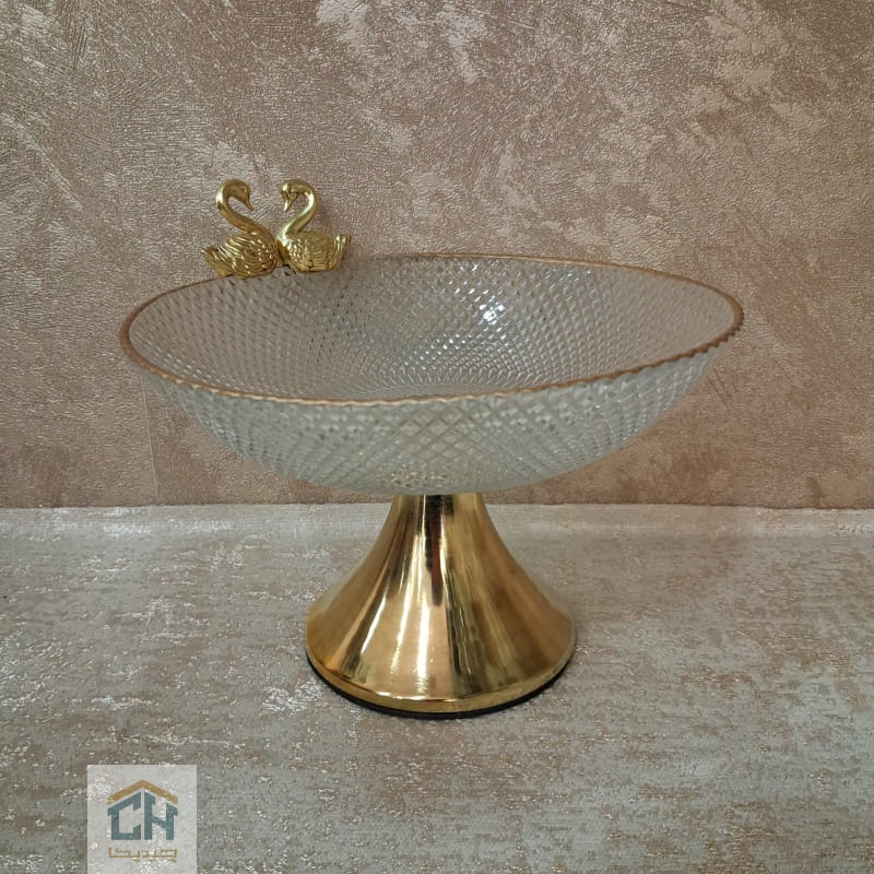 بافت های پیکسلی و برجسته روی بدنه شفاف،نور محیط را مانند منشور بازتاب می دهند.ترکیب این درخشش برای یک آجیل خوری پایه طلایی مقاوم و براق،فضایی گرم و صمیمی ایجاد می کند.حضور دو مجسمه ظریف قو در لبه ظرف،امضای نهایی این شاهکار دکوراتیو است.اگر قصد دارید سرویس آجیل خوری جدید خود را تکمیل کنید،این محصول با ماندگاری بالا،کیفیت ساخت ممتاز و زیبایی کلاسیک،بهترین گزینه برای ثبت خاطرات شیرین در ذهن مهمانان شماست.همین حالا این قطعه جواهرگون را به خانه ببرید.