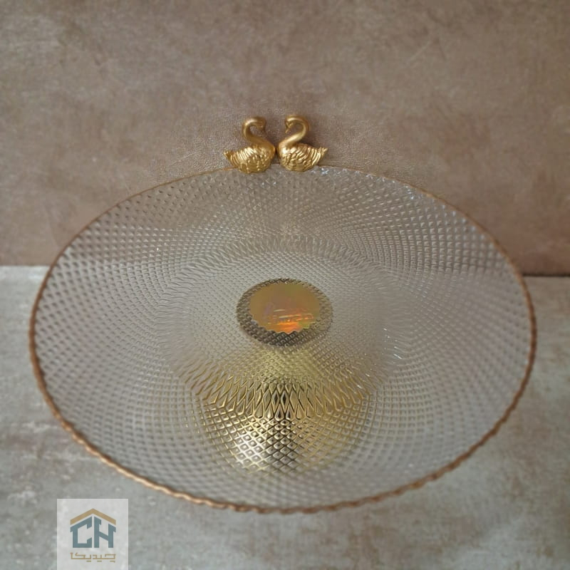 برای کسانی که به دنبال یک شیرینی خوری نقلی شیک هستند،ترکیب بدنه شفاف با بافت پیکسلی و درخشش پایه طلایی،جلوه ای بی نظیر ایجاد کرده است.حضور دو مجسمه قو در لبه ظرف،طراحی این اثر را با جدیدترین ظروف پذیرایی کلاسیک و لوکس همگام کرده است.این قطعه ارزشمند،همان نگینی است که میز پذیرایی شما برای کامل شدن به آن نیاز دارد.