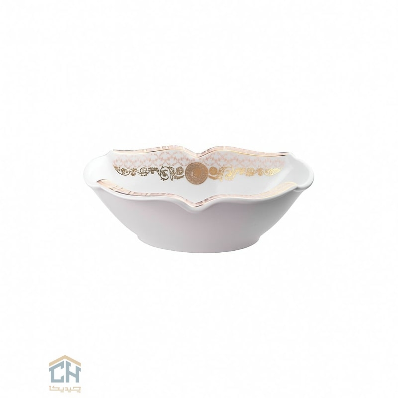 شکل خاص و پیاله بیضی مانندش که با لبه های موج دار و ظریف همراه شده،اولین چیزیه که دلتون رو می بره.بعد نگاهتون میفته به اون حاشیه طلاکوب بی نظیر با الهام از طرح ورساچه که روی سرامیک سفید و درخشانش نشسته و یک هارمونی چشم نواز ساخته.این ست،یک ظرف پذیرایی کوچک و ایده آل برای سرو آجیل،تنقلات،ماست یا حتی دسرهای تک نفره است و به سادگی حال و هوای میزتون رو عوض می کنه.