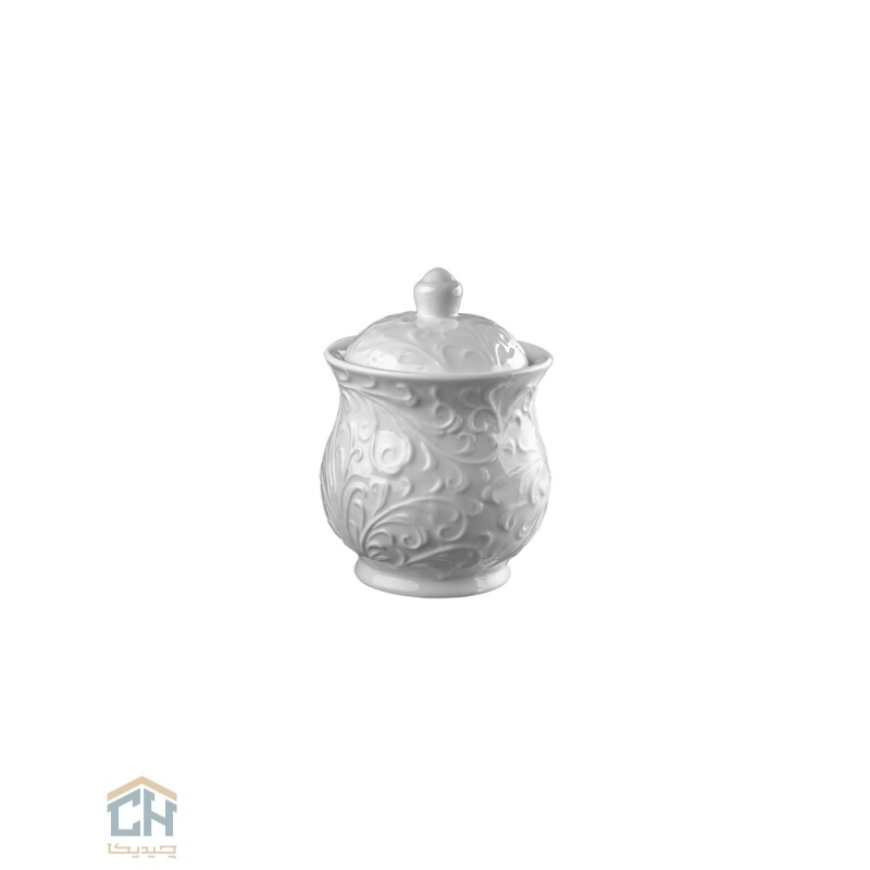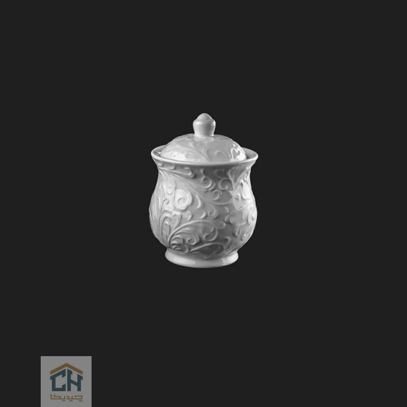 بدنه این قندان با نقوش برجسته و پیچیده طرح رویال تزئین شده است که بر روی سرامیک سفید و درخشان آن،جلوه ‌ای چشم ‌نواز خلق می‌ کند.فرم خمیده و پایه ‌دار آن،همراه با درب و دستگیره ظریفش،این اثر هنری را تکمیل می ‌نماید و آن را به یک قندان شیک و بی ‌همتا تبدیل کرده است.
