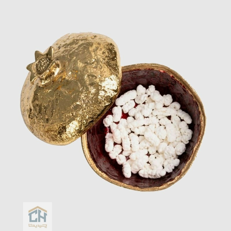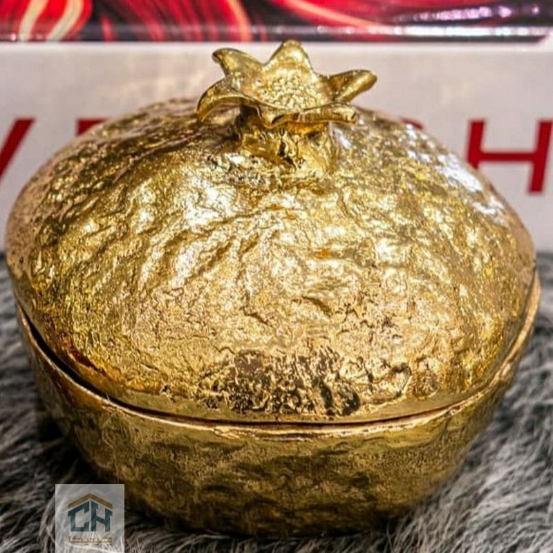 تمام سطح این مربا خوری گلدکیش با بافتی غنی و چکش کاری شده پوشانده شده که به آن ظاهری شبیه به یک گنجینهی باستانی می بخشد.اما اوج شکوه این اثر،در تضاد هنرمندانه آن نهفته است؛با برداشتن درب ستاره ای شکل،قلب یاقوتی و درخشان آن نمایان می شود که یادآور دانه های شیرین و پر برکت انار است.