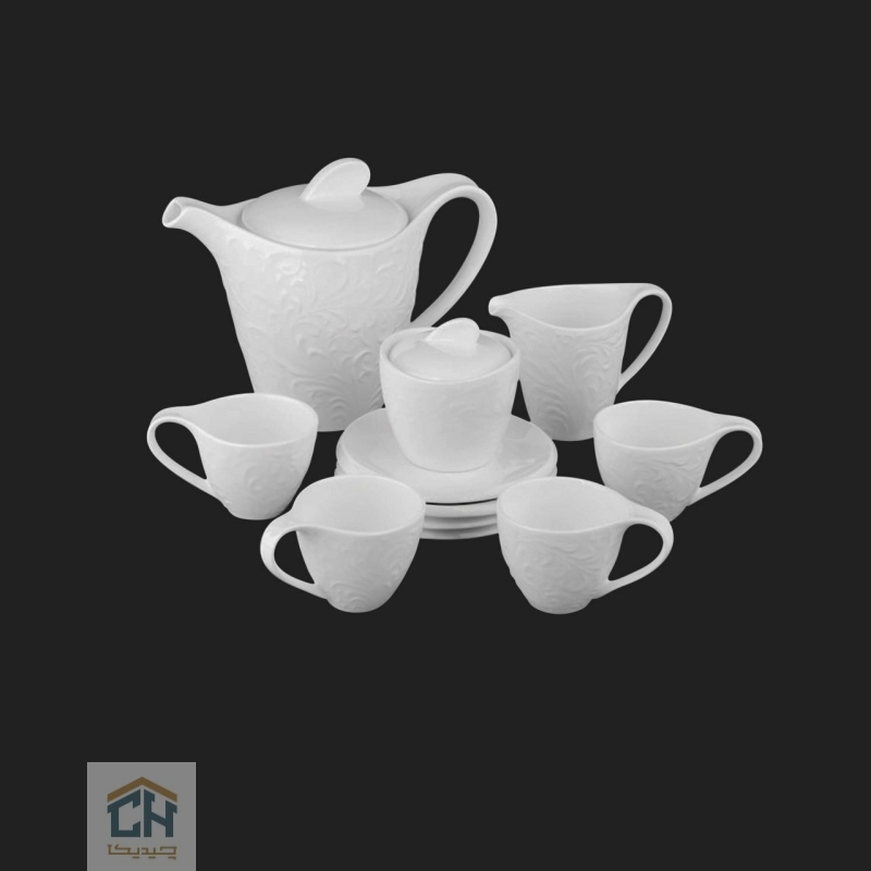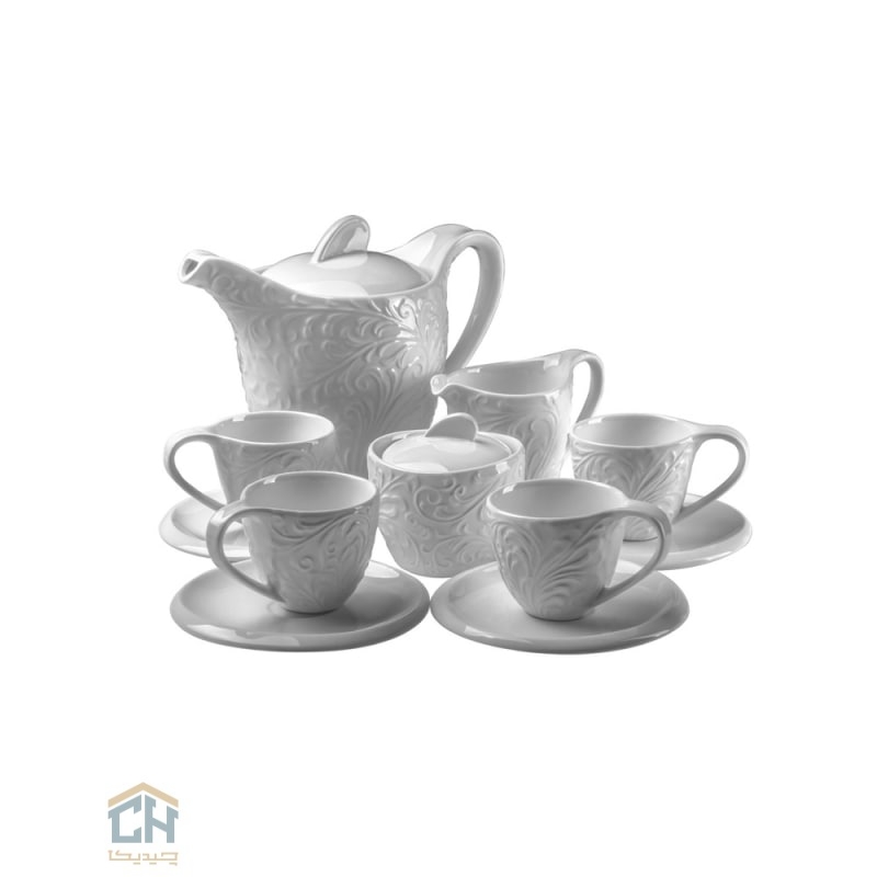 این سرویس قهوه خوری گلدکیش شامل یک قوری،یک قندان،یک شیرخوری(کریمر)و چهار فنجان قهوه سرامیکی به همراه نعلبکی هایشان است.تمام قطعات با نقوش برجسته و پیچیده طرح رویال بر روی سرامیک سفید و درخشان تزئین شده اند و یک هارمونی بصری خیره کننده ایجاد می کنند.