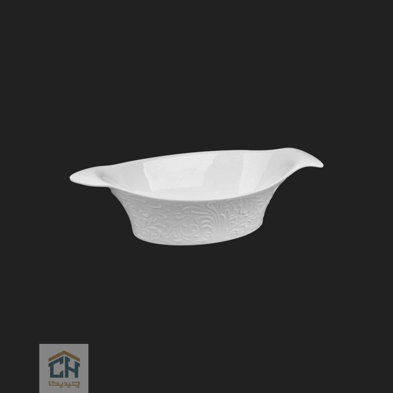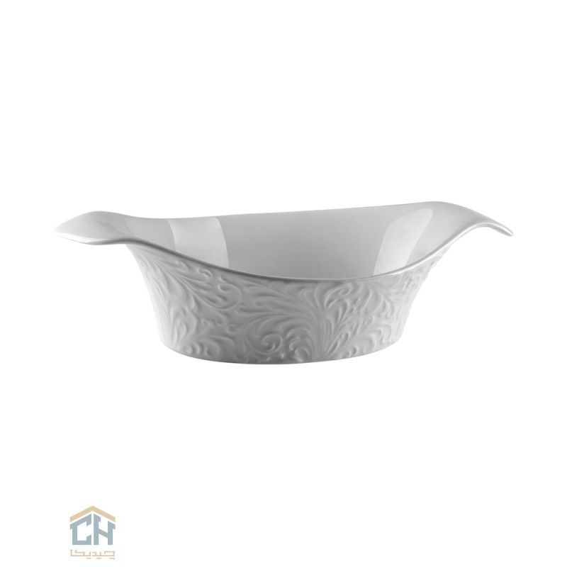 فرم زیبای سالاد خوری بیضی و ابعاد سخاوتمندانه این سالاد خوری بزرگ،آن را به یک ظرف سرو مجلسی بی رقیب برای بزرگ ترین مهمانی ها و گردهمایی های شما تبدیل می کند.بدنه درخشان از جنس سرامیک سفید با نقوش برجسته و پیچیده طرح رویال تزئین شده که چون یک تابلوی هنری می درخشد.