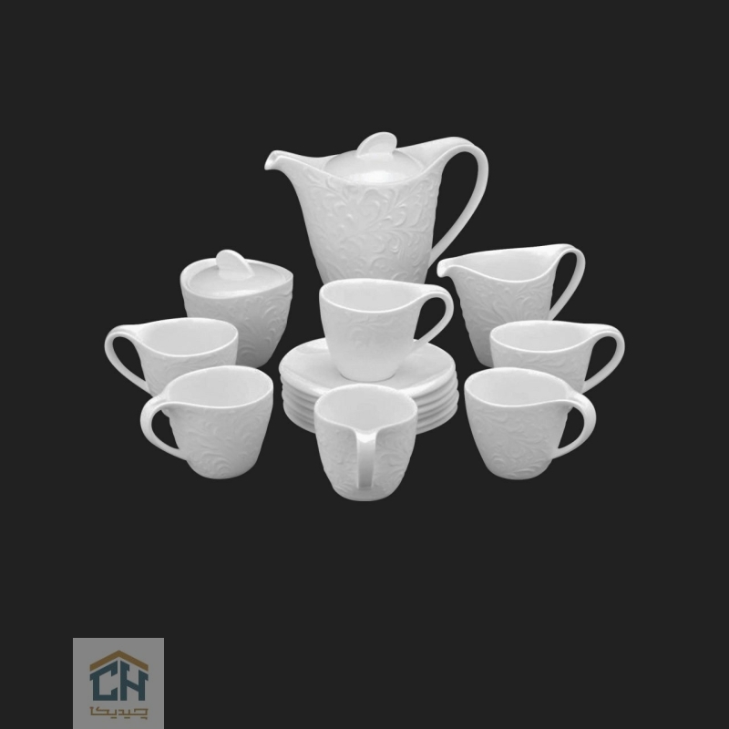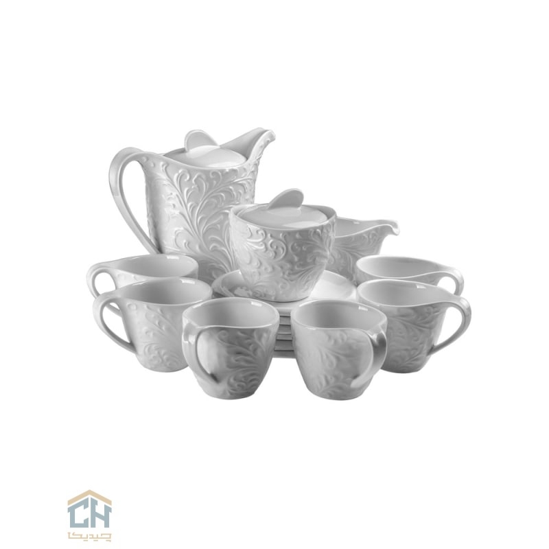 این سرویس چای خوری کلاسیک شامل یک قوری با طراحی با شکوه،یک قندان،یک شیرخوری(کریمر)و شش فنجان چای سرامیکی به همراه نعلبکی هایشان است.تمام قطعات با نقوش برجسته و پیچیده طرح رویال بر روی سرامیک سفید و درخشان تزئین شده اند و یک هارمونی بصری خیره کننده ایجاد می کنند.