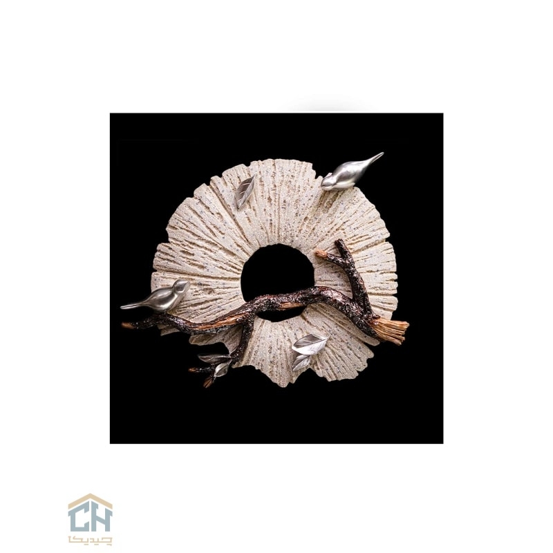 این تابلو برجسته،روایتی از یک لحظه آرام در طبیعت است.فرم دایره ای ناقص با بافت سنگی و رنگ کرم،در کنتراستی شگفت انگیز با دو پرنده نقره ای براق قرار گرفته است.این طرح پرنده که با ظرافتی مینیمال بر روی شاخه ای تیره و واقع گرایانه نشسته،حسی از سکون و پویایی را به طور همزمان به بیننده منتقل می کند.