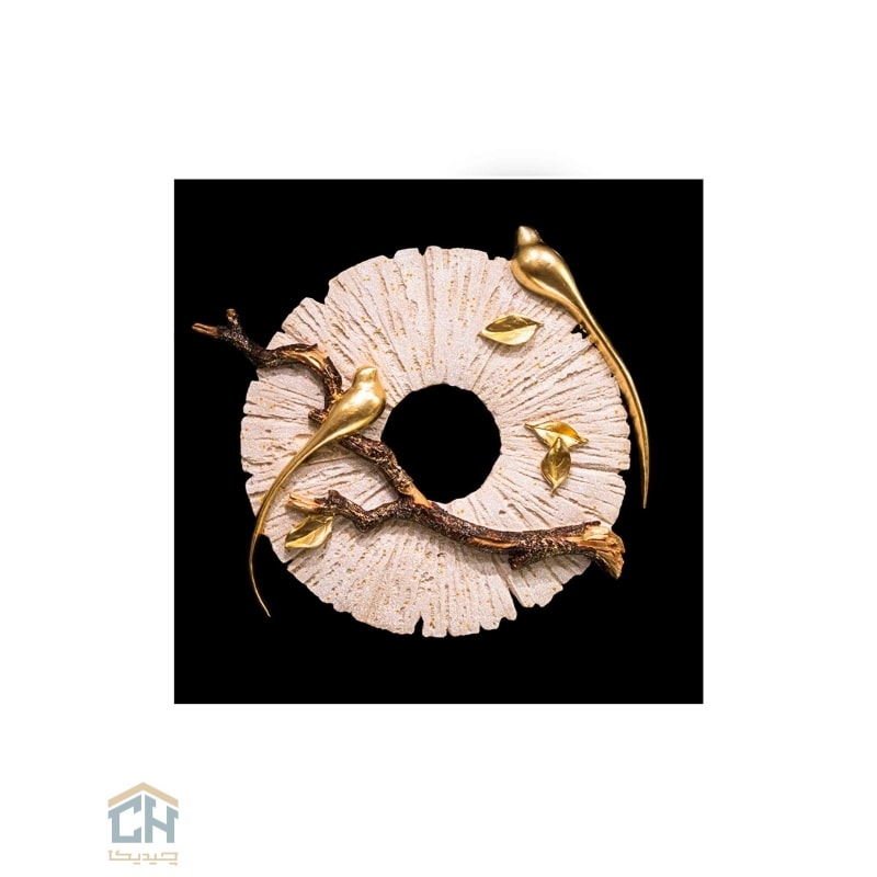 این تابلو پلی رزین،روایتی از طبیعت در یک قاب مدرن است.حلقه مرکزی با بافت سنگی و ناهموار خود،در تضادی خیره کننده با دو پرنده طلایی با دم های کشیده و براق قرار گرفته است.این طرح پرنده که بر روی شاخه ای تیره و واقع گرایانه نشسته،حسی از آرامش و پویایی را همزمان القا می کند.