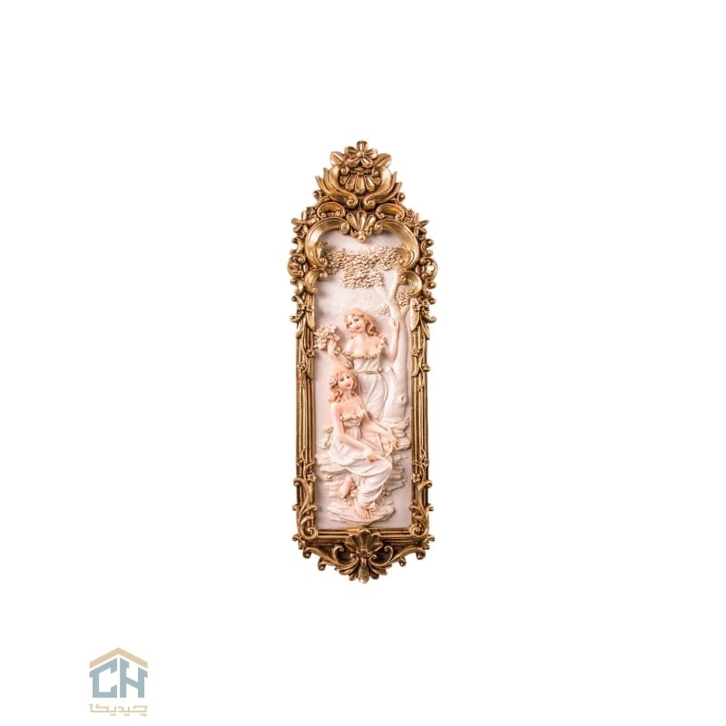 این تابلو پلی رزین که با دقت و وسواس از مواد اولیه با کیفیت ساخته شده،صحنه ای دلنشین از دو بانوی زیبا در طبیعتی آرام را به تصویر می کشد.جزئیات لباس ها،چهره ها و درختان،همگی با ظرافتی خیره کننده تراش خورده اند.این صحنه لطیف،در یک قاب طلایی مجلل و پرکار به سبک سلطنتی قرار گرفته که تضاد رنگی آن با فیگورهای کرم رنگ،یک هارمونی بصری فراموش نشدنی خلق می کند.